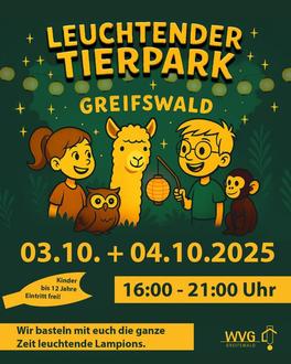 Am 3. und 4. Oktober 2025 verwandelt sich der Tierpark Greifswald von 16:00 bis 21:00 Uhr in ein leuchtendes Wunderland. Unter dem Motto „Leuchtender Tierpark“ erwartet die Besucher ein buntes Programm mit Licht, Musik und Mitmachaktionen.