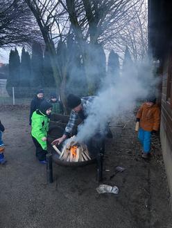 Die Kinder heizen mit Herrn Strelow das Feuer an.