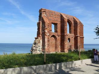Blick auf die Ruine der Kirche von Hoff (Trzęsacz) an der pommerschen Ostseeküste.