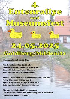 Am 24. Mai findet das jährliche Museumsfest im Natur-Museum Goldberg statt. Auf dem Gelände des Museums mit seiner romantischen Streuobstwiese und dem Kräutergarten gibt es einen kleinen Markt für regionale Produkte und selbstverständlich einen Imbiss, Kaffee, Waffeln, Eis und mehr. Erstmals wird es auch Kuchen aus unserem neuen Lehmbackofen geben; der Eintritt ins Museum ist frei. Das Fest entwickeln wir damit zu einem kleinen Regionalmarkt, und hoffen, dieses neue Format auch in den nächsten Jahren fortsetzen zu können. Das Fest beginnt um 11:00 Uhr und endet gegen 16:00 Uhr. Dann startet vor dem Museum die 4. Goldberger Entenrallye auf der Mildenitz.