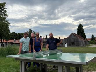 Frisch aufgestellt präsentieren Bürgermeister Dirk Mittelstädt, Dirk Brinckmann, Andreas Bünger und Marco Bergunde (v.l.n.r.) die neue Tischtennisplatte.