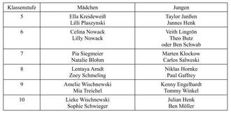 Bei den Jungen konnten sich Luca Böhme mit 151 Seildurchschlägen pro Minute in den 6. Klassen und Julian Henk mit 8,15 m im Dreierhopp bei den 10.-Klässlern hervorheben.