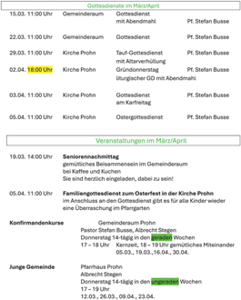 | 18:00 Uhr | Kirche Prohn, Gründonnerstag, liturgischer GD mit Abendmahl, Pf. Stefan Busse |