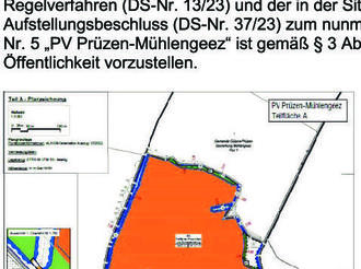 Der von der Gemeindevertretung Gülzow-Prüzen in der Sitzung am 30.05.2023 aufgestellte Bebauungsplan Nr. 5 „PV Prüzen-Mühlengeez“ der Gemeinde Gülzow-Prüzen im Regelverfahren (DS-Nr. 13/23) und der in der Sitzung am 14.12.2023 geänderte Aufstellungsbeschluss (DS-Nr. 37/23) zum nunmehr vorhabenbezogenen Bebauungsplan Nr. 5 „PV Prüzen-Mühlengeez“ ist gemäß § 3 Abs. 1 BauGB bereits frühzeitig der Öffentlichkeit vorzustellen.