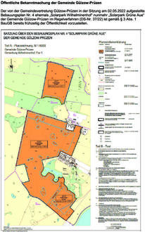 Der von der Gemeindevertretung Gülzow-Prüzen in der Sitzung am 02.05.2022 aufgestellte Bebauungsplan Nr. 4 ehemals „Solarpark Wilhelminenhof“ nunmehr „Solarpark Grüne Aue“ der Gemeinde Gülzow-Prüzen im Regelverfahren (DS-Nr. 37/22) ist gemäß § 3 Abs. 1 BauGB bereits frühzeitig der Öffentlichkeit vorzustellen.