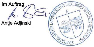| Die genaue Abgrenzung nach Flurstücken kann beim Staatlichen Amt für Landwirtschaft und Umwelt Mittleres Mecklenburg, Dienststelle Bützow, Schlossplatz 6, 18246 Bützow in einem Zeitraum von zwei Wochen nach der öffentlichen Bekanntmachung zu den Sprechzeiten des Amtes oder zu vereinbarten Terminen eingesehen werden. |