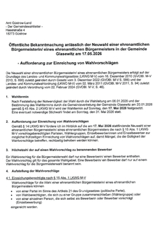 Gemäß § 14 LKWG M-V fordere ich im Hinblick auf die am 17. Mai 2026 stattfindende Neuwahl einer ehrenamtlichen Bürgermeisterin/ eines ehrenamtlichen Bürgermeisters die nach § 15 Abs. 1 LKWG M-V vorschlagsberechtigten Parteien, Wählergruppen, Einzelbewerberinnen und Einzelbewerber zur möglichst frühzeitigen Einreichung von Wahlvorschlägen auf, damit Mängel, die die Gültigkeit der Wahlvorschläge betreffen, rechtzeitig behoben werden können.