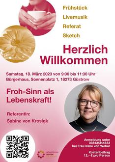 Unsere Referentin Sabine von Krosigk (Braunschweig) weiß, wie wir aus sorgenvollen, ärgerlichen Gedanken in eine lebensbejahende Haltung finden können. Sie ist Lehrerin, Lebens- und Sozialberaterin und Psychotherapeutin. Lassen Sie sich also wieder zu einem abwechslungsreichen Vormittag mit leckerem Frühstück, Live-Musik und vielen guten Anregungen einladen!