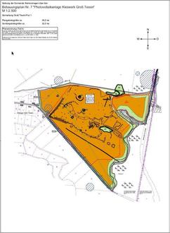 Die Gemeindevertretung beschließt die Aufstellung des Bauungsplanes Nr. 7 „Photovoltaikanlage Kieswerk Groß Tessin“ für den in der Anlage 1 dargestellten Geltungsbereich innerhalb der Gemarkung Groß Tessin, Flur 1, Flurstücke 4/2 und 22/3 sowie einer Teilfläche des Flurstücks 22/2. Das Plangebiet umfasst eine Größe von ca. 39,5 ha.