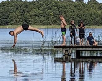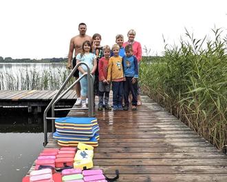 Es ist daher sehr wichtig, dass unsere Kinder so früh wie möglich, Sicherheit im Umgang mit dem Wasser erhalten. Der Sommerkurs Wassergewöhnung und Schwimmunterricht hat nun in einem ersten Durchgang vom 29. Juli - 2. August 2024 an der Badestelle Mühl Rosin stattgefunden. Finanziert wurde der Kurs freundlicherweise von der Stiftung der Ostseesparkasse und der Deutschen Ehrenamtsstiftung. Die Nachfrage war erwartungsgemäß sehr hoch. Der Sommerkurs war trotz der Ferienzeit im Handumdrehen ausgebucht. 36 Kinder im Alter von 3 - 8 Jahren bekamen die Möglichkeit Wassergewöhnung oder Schwimmunterricht zu erhalten.
