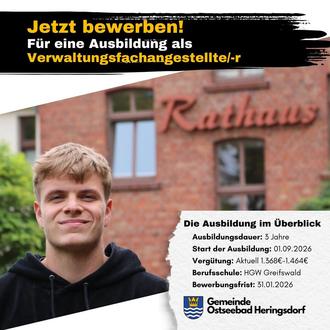 *Es handelt sich um kein neues Auswahlverfahren. Die Gemeinde Heringsdorf gewährt lediglich eine Fristverlängerung bis zum 31.01.2026, um weiteren Interessenten die Möglichkeit zu bieten, sich auf die Ausbildungsstelle zu bewerben.