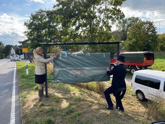 Die Gelegenheit dieses Treffens in Alt Sallenthin wurde genutzt, um eins der neuen Dorfeingangsschilder zu enthüllen. Bekanntlich waren die alten vor einigen Jahren mutwillig zerstört worden. Sie wurden von vielen vermisst. Die 770-Jahr-Feier war ein schöner Anlass, sie wieder anzubringen. Der Eigenbetrieb und Mitglieder des Geschichtsvereins hatten gemeinsam die neuen Schilder entwickelt, der Bauhof kümmerte sich um deren Erstellung und die Montage in den frisch gestrichenen Rahmen und nun begrüßen - oder verabschieden - sie wieder Vorüberfahrende und Passanten.