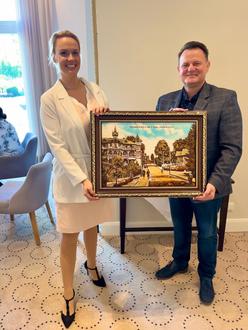 Der Stellvertretende Stadtpräsident der Stadt Swinemünde, Paweł Sujka, überreicht ein Geschenk des Bürgermeisters aus Truskawez (Ukraine), als Dank für die gemeinsame Hilfsaktion der Stadt Swinemünde und der Gemeinde Ostseebad Heringsdorf