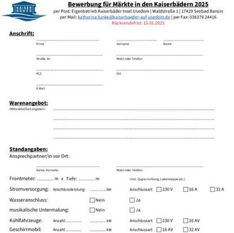 Im Anhang finden Sie die aktuelle Ausschreibung für die Märkte 2025. Zusätzlich folgen in den nächsten Tagen auch noch Ausschreibungen für weitere Veranstaltungenin den Kaiserbädern sowie für Baltic Lights (28.02.-02.03.25) in Kooperation mit ExperiArts.
