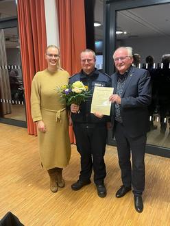 Die Bürgermeisterin, Laura Isabelle Marisken und der Vorsitzende des Gemeinderates, Joachim Saupe, gratulieren Herrn Wischow zur Ernennung als Ehrenbeamten der Freiwilligen Feuerwehr Ahlbeck.