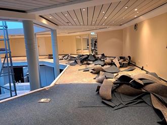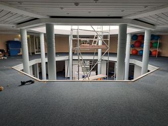 Eine der auffälligsten Modernisierungen betrifft die Galerie oberhalb des Massagebereichs. Das in die Jahre gekommene Holzgeländer wurde durch ein elegantes Edelstahlgeländer mit Glasflächen ersetzt. Dies sorgt nicht nur für eine ansprechendere Optik, sondern ermöglicht auch eine höhere Kapazität für Kursteilnehmer unserer Trockenkurse. Zudem wurde der 30 Jahre alte Teppichbelag durch einen modernen, strapazierfähigen Bodenbelag ersetzt.