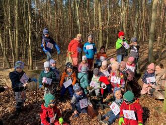 Der Abschluss der Woche bildete am Freitag eine gemeinsame „Rettungsaktion“, denn Schrotti war verschwunden, er ist in den angrenzenden Wald gegangen, um Müll zu sammeln und hat sich verlaufen. Daher haben sich alle gemeinsam auf den Weg durch den Wald gemacht, um Schrotti zu finden, haben dabei Müll gesammelt und Hinweise gesucht.