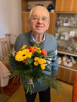 Herr Martin Molz aus Bansin Dorf freute sich über die Gratulation und den Blumenstrauß der Bürgermeisterin Dr. Laura Isabelle Marisken anlässlich seines 90. Geburtstages.