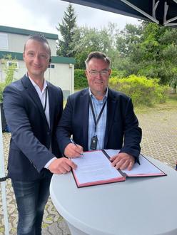 Deutsch-polnisches Polizeiteam; Herr Speck, Geschäftsführer der WOG bei der Unterzeichnung des Mietvertrages mit der Polizei für den neuen Stützpunkt des deutsch-polnischen Polizeiteams