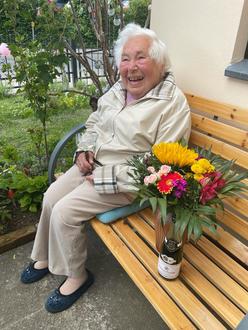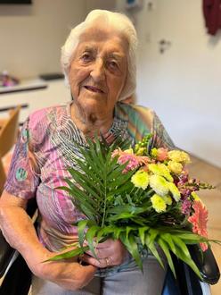 Auch Frau Sauck ist ganz nah an der 100 dran. Zum 99. Geburtstag überreichte ihr Dr. Laura Isabelle Marisken bunte Blumen für weitere bunte Jahre.