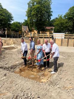 Feierlicher Spatenstich für neuen sozialen Wohnungsbau in Bansin. V.l.n.r.: Mike Speck – Geschäftsführer Wohnungsgesellschaft Ostseebad Heringsdorf, Steffen Pfefferkorn - Amtsleiter Bau Landkreis Vorpommern-Greifswald, Laura Isabelle Marisken – Bürgermeisterin der Gemeinde Ostseebad Heringsdorf, Andreas Woitassek - Architekt und Prokurist gmw Planungsgesellschaft mbh, Joachim Saupe - Vorsitzender der Gemeindevertretung.