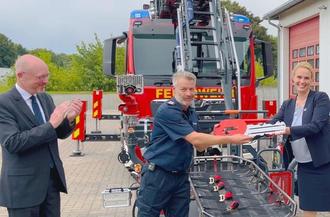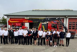 Sichtbar gefreut haben sich die Kameradinnen und Kameraden unserer Gemeindefeuerwehr: Im Beisein von Innenminister Christian Pegel wurde die neue Drehleiter an Gemeindewehrführer Andreas Räsch übergeben.