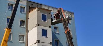 An dem Mehrfamilienhaus mit vier Aufgängen werden Module angebaut, zugemauert und gedämmt.
