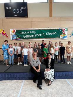 Schülerinnen und Schüler der Theatergruppe der Klassenstufe 4 führten zur Einschulung unter der Leitung von Frau Ewert das Stück "Die verschwundenen Zahlen" auf. Vorne sitzen die Bürgermeisterin, Frau Dr. Laura Isabelle Marisken und die Schulleiterin der Grundschule Heringsdorf, Grit Vehreschild