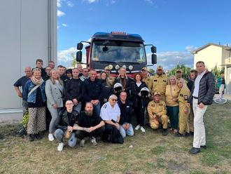 Die Stadtpräsidentin von Swinemünde, Frau Agatowska, und unsere Bürgermeisterin, Frau Dr. Marisken, (beide mittig) zusammen mit den Kameradinnen und Kameraden der Freiwilligen Feuerwehren Ahlbeck und Swinemünde beim Feuerwehrfest in Swinemünde