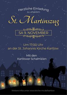 Wir laden wieder herzlich ein zum St. Martins-Umzug in Kartlow am Samstag, den 9. November, mit Andacht vor der St. Johanniskirche, Umzug durch’s Dorf begleitet von unserer Feuerwehr und im Anschluss warme Verpflegung und Beisammensein an der Feuerschale auf dem Pfarrhof. Wir freuen uns auf euch!