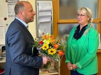 Bunte Blumen und nette Worte für die neue Chefin der Grundschule Jarmen: Bürgermeister André Werner beglückwünscht Dana Röthemeier (rechts)