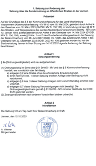 Auf der Grundlage des § 5 der Kommunalverfassung für das Land Mecklenburg-Vorpommern (Kommunalverfassung - KV M-V) vom 16. Mai 2024, geändert durch Artikel 4 des Gesetzes vom 18. März 2025 (GVOBI. MV S. 130,136), in Verbindung mit den §§ 22 ff. des Straßen- und Wegegesetzes des Landes Mecklenburg-Vorpommern (StrWG - MV) vom 13. Januar 1993, zuletzt geändert durch Artikel 8 des Gesetzes vom 14. Mai 2024 (GVOBI. M-V S. 154, 184), sowie § 8 Abs. 1 und 3 des Bundesfernstraßengesetzes in der Fassung der Bekanntmachung vom 28. Juni 2007 (BGBI. I S, 1206), das zuletzt durch Artikel 1 des Gesetzes vom 22. Dezember 2023 (BGBI. 2023 Nr. 409) geändert worden ist, hat die Stadtvertretung Jarmen in ihrer Sitzung am 14.10.2025 folgende Änderung der Satzung beschlossen: