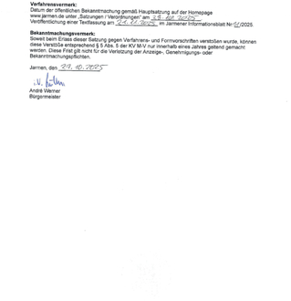 Datum der öffentlichen Bekanntmachung gemäß Hauptsatzung auf der Homepage www.jarmen.de unter „Satzungen / Verordnungen" am 28.10.2025.