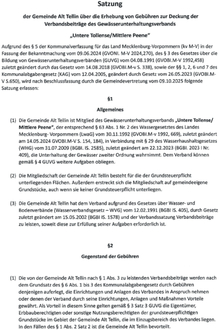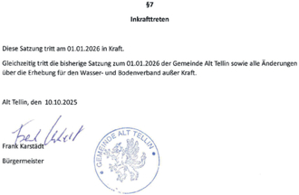 Gleichzeitig tritt die bisherige Satzung zum 01.01.2026 der Gemeinde Alt Tellin sowie alle Änderungen über die Erhebung für den Wasser- und Bodenverband außer Kraft.