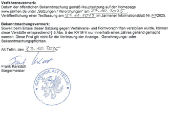 Datum der öffentlichen Bekanntmachung gemäß Hauptsatzung auf der Homepage www.jarmen.de unter „Satzungen / Verordnungen" am 27.10.2025.