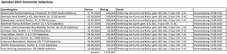 | Fred Henning, Stephanusstr. 58, 33098 Paderborn | 13.08.2024 | 20,00 € | Förderung von Kunst und Kultur gem. §52 Abs. 2 Satz 1 Nr. 5 AO | Veranstaltung 10.08.2024 |