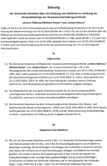 Aufgrund des § 5 der Kommunalverfassung für das Land Mecklenburg-Vorpommern (kv M-V) in der Fassung der Bekanntmachung vom 09.06.2024 (GVONI. M-V 2024,270), des § 3 des Gesetzes über die Bildung von Gewässerunterhaltungsverbänden (GUVG) vom 04.08.1991 (GVOBI.M-V 1992,458) zuletzt geändert durch das Gesetz vom 14.08.2018 (GVOBI.M-v S. 338), sowie der §§ 1, 2, 6 und 7 des Kommunalabgabengesetz (KAG) vom 12.04.2005, geändert durch Gesetz vom 26.05.2023 (GVOBI.M-V S.650), wird nach Beschlussfassung durch die Gemeindevertretung vom 13.10.2025 folgende Satzung erlassen: