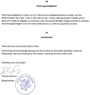 Gleichzeitig tritt die bisherige Satzung zum 01.01.2026 der Gemeinde Daberkow sowie alle Änderungen über die Erhebung für den Wasser- und Bodenverband außer Kraft.