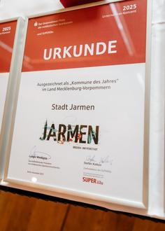 Am 27. November wurde Jarmen als Kommune des Jahres in Mecklenburg-Vorpommern durch den Ostdeutschen Sparkassenverband (OSV) in Potsdam ausgezeichnet. Dieser Preis gilt den Menschen vor Ort, die sich ehrenamtlich für das Gemeinwohl in Jarmen und Ortsteilen einsetzen. Die lokale Zivilgesellschaft – bestehend aus Lokalpolitik, Vereinen, Verbänden, Feuerwehr, Kirchgemeinde und vielen weiteren Akteure – trägt dazu bei, dass wir uns alle wohlfühlen und ein gutes Miteinander leben. Ein Teil dieser Akteure begleitete uns zur würdevollen Auszeichnungsveranstaltung nach Potsdam. Herzlichen Dank dafür! Großer Dank gilt Bruno Weber und Jörg Berner von unserem regionalen Finanzpartner vor Ort – der Sparkasse Vorpommern –, die uns hierbei großartig unterstützt haben. Unsere Bewerbung sowie die Präsentation vor einer großen Jury vorab wurden tatkräftig durch das Engagement der Kulturbrücke Peene-Tollense e. V. unterstützt.