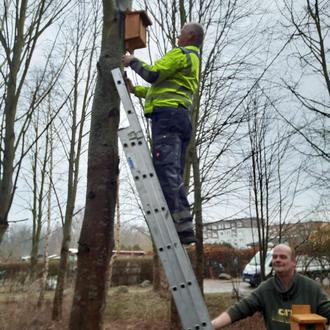 Ralph Wetzel vom städtischen Bauhof beim Anbringen der Nistkästen.