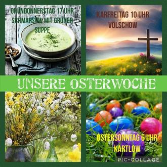 Wie im vergangenen Jahr wollen wir die besonderen Tage vor und um Ostern gemeinsam begehen. So laden wir am Gründonnerstag wieder zu Andacht und Grüner Suppe ein, diesmal nach Schmarsow. Karfreitag bedenken wir das Sterben Jesu in der Völschower Kirche. Seine Auferstehung wollen wir wieder ganz früh am Ostermorgen in der Kartlower Kirche erfahren und laden im Anschluss zum kleinen Kaffee und Osterbrot ins Pfarrhaus, bevor jeder mit seinen Lieben Zuhaus hoffentlich eine gesegnete und schöne Osterfreude erleben kann!