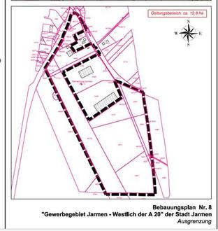 Der Bebauungsplans Nr. 8 „Gewerbegebiet Jarmen, westlich der A 20“ hat eine Größe von 12,8 ha und umfasst die Flurstücke 426/9, 441/22, 441/24, 441/25, 442/18, 442/20, 442/28, 442/32, 444/7, 444/8, 447/1, 447/2, 448/1, 487/8, 487/9, 488/1, 490/1, 498/6, 489/7 der Flur 1 in der Gemarkung Jarmen.