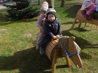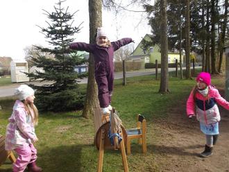 Seit einigen Tagen haben wir auch tierischen Zuwachs auf unserem Kitagelände bekommen. Und zwar können unsere Kinder jetzt mit einem kleinen und einem großen Holzpferd spielen und schon einmal das Reiten üben. Es gibt auch allerhand Zubehör, wie z. B. Halfter, Zügel, Sattel und Satteldecke. Die Kinder haben viel Spaß und Freude daran, die Pferde für die Ausritte fertig zu machen, aber auch das Voltigieren wird schon fleißig geübt. Nicht nur die größeren Kinder haben ihre Freude an den Pferden, auch unsere Kleinsten und so manche Erzieherin erfreuen sich daran.