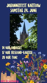 In diesem Jahr fällt der Johannistag auf einen Samstag und wir hatten schon lange kein Gemeindefest mehr unter unserer schönen Friedens-Eiche am Pfarrhaus! Also starten wir mit einer Andacht um 14 Uhr in der St. Johannis Kirche. Danach gibt es Kaffee und Kuchen vor dem Pfarrhaus und für unsere Kleinsten wieder eine tolle große Hüpfburg. Im lauschigen Pfarrgarten gibt es zu 17 Uhr einen „Freiland-Lausch“ - ein Hörspiel im Freien, bei dem man sich bei einer Sommer-Bowle oder einem Glas Rosé auf seiner Picknickdecke wegträumen kann. Und am Abend kann dann auch gerne das Tanzbein geschwungen werden. Ab 20 Uhr legt Dirk Kobernuß Musik auf! Herzliche Einladung also zu unserem Gemeindefest in Kartlow am Samstag, den 24. Juni!