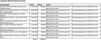 Die Gemeindevertretung Alt Tellin beschließt über die Entgegennahme von Spenden gemäß § 44 Kommunalverfassung MV für das Haushaltsjahr 2023.