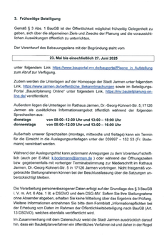 | Zudem werden die Unterlagen auf der Homepage der Stadt Jarmen unter folgendem Link, https://www.jarmen.de/oeffentliche_Bekanntmachungen sowie im Beteiligungs-Portal „Bauleitplanung Online“ unter folgendem Link, https://mv.bauleitplanung-online.de/ veröffentlicht. | |