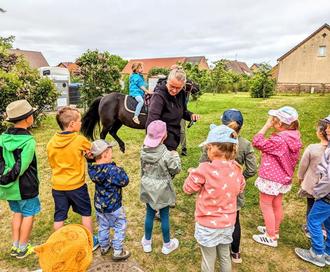Der Höhepunkt unseres Tages jedoch war der Besuch von Patrick Schulz mit seinem Pony. Die Kinder durften nicht nur aus der Nähe Beobachten und Streicheln, sondern auch Reiten. Für viele unserer „Wühlmäuse“ war es „ihr erstes Mal“ ein Pony so zu fühlen…