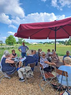 Am 22. Juni 2023 trafen sich 17 Teilnehmer, um mehr über die Geschichte von Schloss Brook zu erfahren. Bei schönem Sonnenwetter trafen wir uns im Biergarten mit dem Projektleiter Herrn Schmidt. Dieser informierte uns kenntnisreich und sehr unterhaltend über die Vergangenheit, die Gegenwart und über die geplante Zukunft mit ihren vielen Aufgaben und Erwartungen. Anschließend besuchten wir die Ausstellung im Schloss. Zurück im Biergarten stärkten wir uns bei Kaffee und Obsttorte. Herr Schmidt antwortete uns nun auf unsere vielen Fragen.