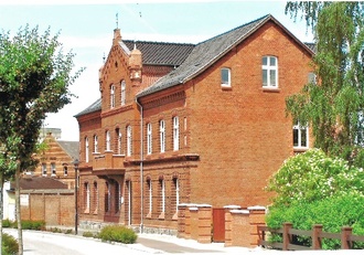 Wir kommen an der ehemaligen Villa Henk vorbei, nun der Sitz vom Steuerbüro Meier & Kossen. Mittig auf der Ansichtskarte von 1909 sieht man den 14 Meter hohen Schornstein des Elektrizitätswerkes. Das Gebäude rechts daneben ist das Hauptgebäude der damaligen Maschinenfabrik.