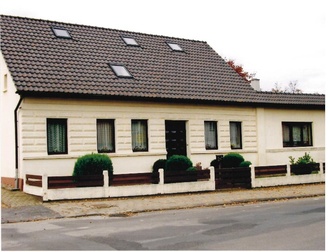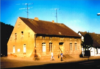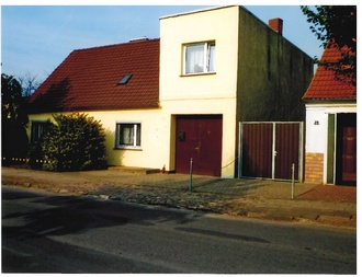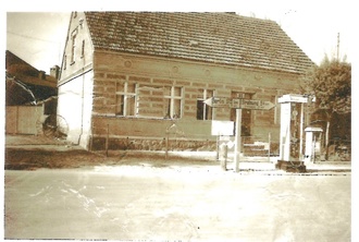 Weiter in Richtung der ehemaligen Molkerei kommen wir an der ehemaligen Freibank Kunstmann vorbei. Dem gegenüber in der Nr. 33 befand sich einst die Werkstatt des Schmiedemeisters Georg Krüger. Auf dem kleinen Foto kann man die Tankstelle erkennen, die vor dem Wohnhaus stand.